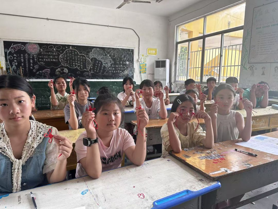 民俗文化下吉祥的祝福降臨在落日的余暉。手工課上,紅繩巧綰結經緯。龍熙老師指尖捻轉間,絲線交錯纏繞,中國結的吉祥紋路漸次顯現,仿佛將歲月的祝福都織入繩間。孩子們凝視著手中的作品,紅繩映著笑靨,傳統文化的根脈在指尖輕觸間悄然延伸,無聲滋養著稚子之心。項鏈與手鏈的裝飾與選擇之下,孩子們較真的雙手蘊含著對成功孜孜不倦的渴求,孩子們好奇的目光展現著對求學堅持不懈的追逐。