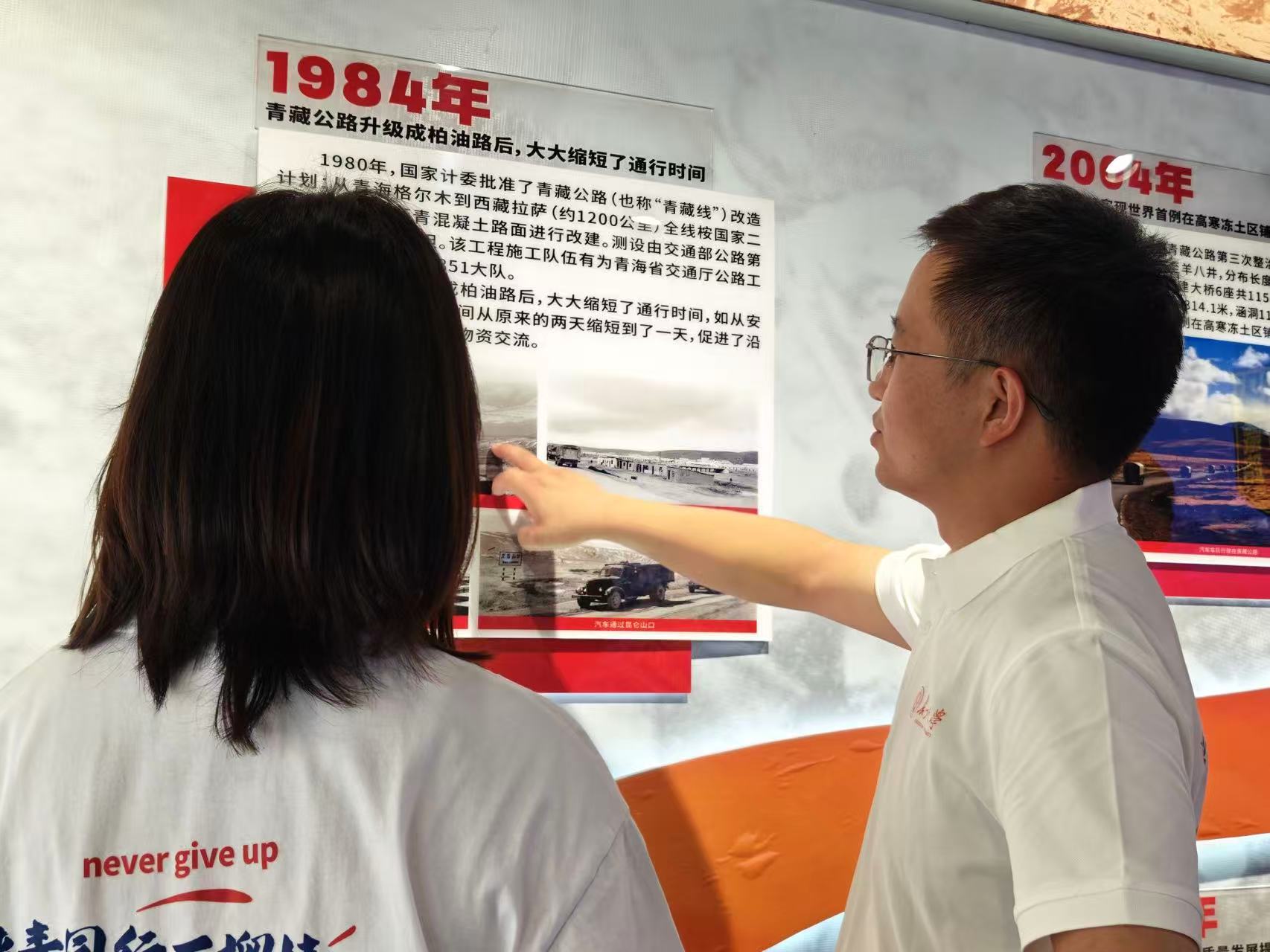 下午,實踐隊員們前往的青藏公路文化體驗館,是系統(tǒng)展現(xiàn)青藏公路發(fā)展歷程的重要窗口。該體驗館通過實物陳列、場景還原、多媒體互動等豐富形式,全面呈現(xiàn)了青藏公路從艱難修建到如今保障交通運輸?shù)膲验煔v程,生動詮釋了 “一不怕苦、二不怕死,頑強拼搏、甘當路石,軍民一家、民族團結(jié)” 的青藏公路精神,為人們了解青藏公路的歷史與文化提供了直觀而深刻的平臺。抵達體驗館后,實踐隊員們迅速投入調(diào)研活動。他們在館內(nèi)認真參觀每一處展區(qū),仔細觀看珍貴的歷史圖片、文獻資料和實物展品,不時駐足交流感悟。隊員們主動向館內(nèi)工作人員請教青藏公路修建中的感人事跡、技術(shù)難題及精神傳承等問題,并詳細記錄調(diào)研筆記,深入探尋青藏公路背后的故事與精神內(nèi)涵。