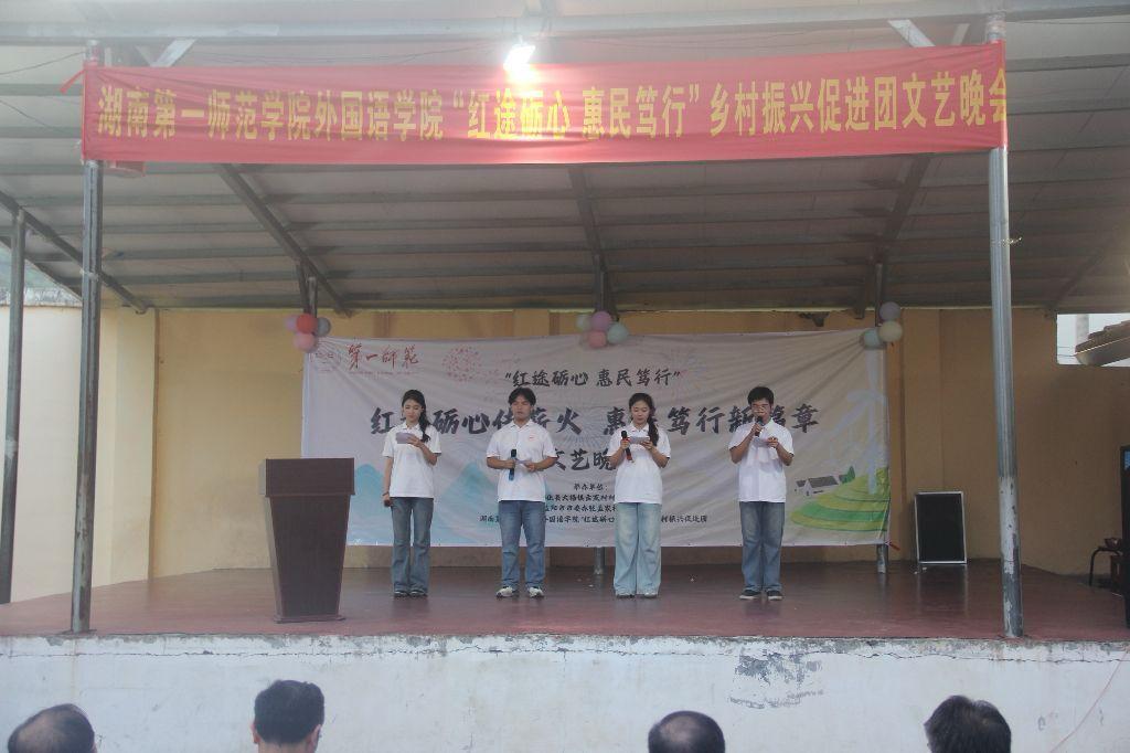 7月13日,湖南第一師范學(xué)院外國語學(xué)院“紅途礪心,惠民篤行” 鄉(xiāng)村振興促進(jìn)團(tuán)在益陽市實(shí)踐基地開展了一場以“紅途礪心傳薪火,惠民篤行新篇章”為主題的文藝晚會,這場融合“線下展演+云端直播”的活動,以青春之姿深耕鄉(xiāng)村沃土,用文藝力量書寫擔(dān)當(dāng),為鄉(xiāng)村振興注入文化動能。