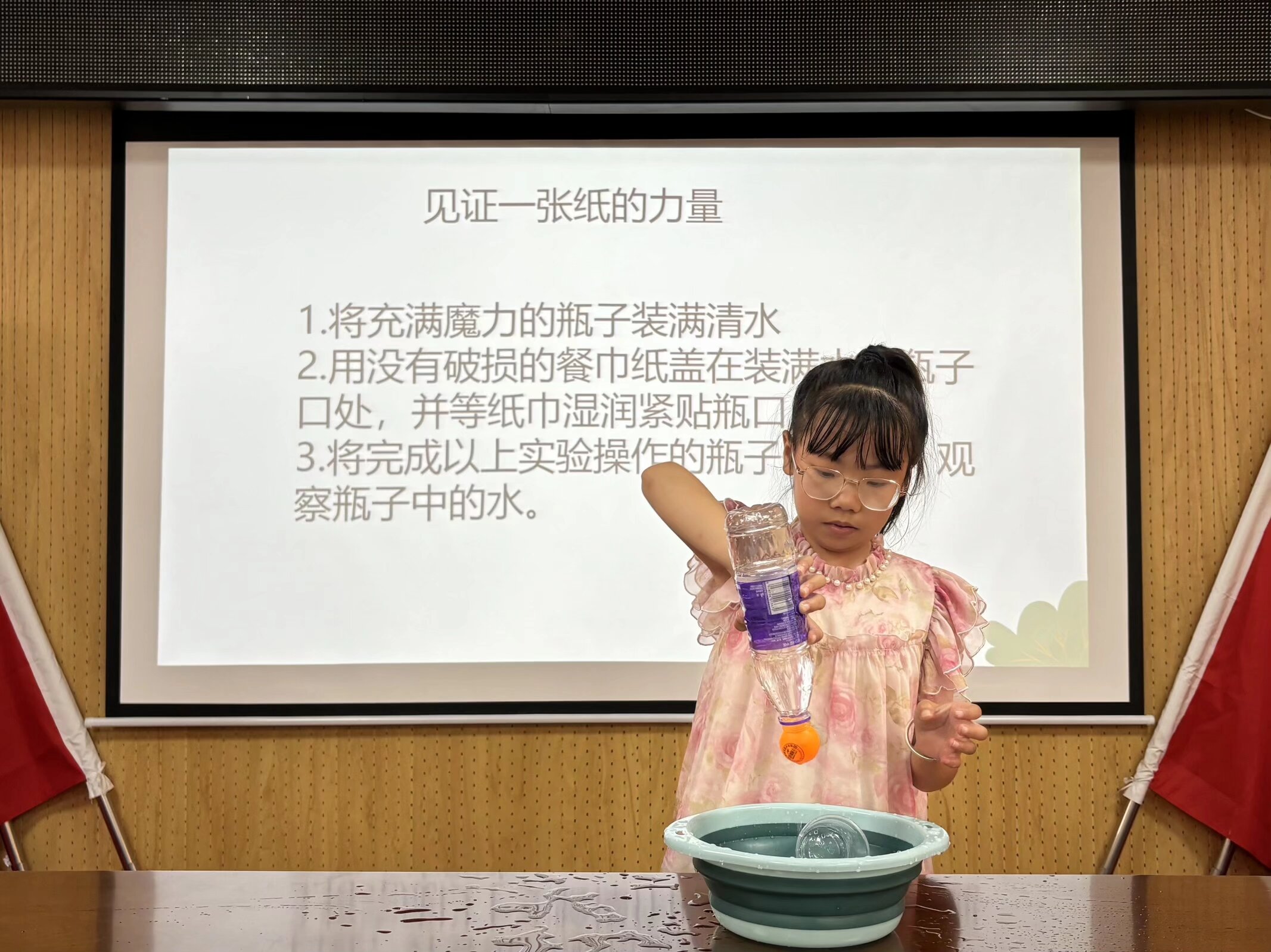 圖為小朋友用塑料瓶和乒乓球親自感受大氣壓強的力量。張慧 供圖