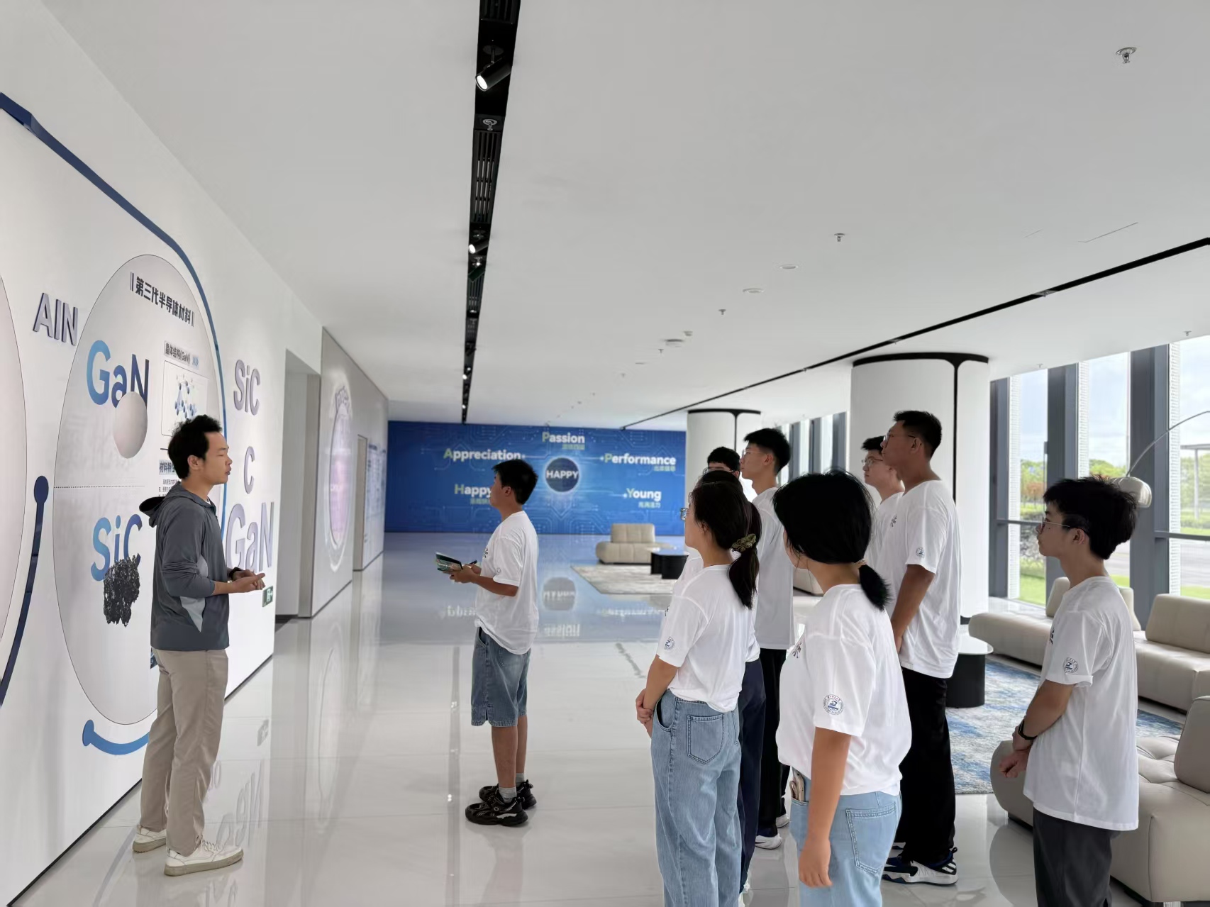 8 日清晨,實(shí)踐隊(duì)首站走進(jìn)英諾賽科。這家在第三代半導(dǎo)體領(lǐng)域獨(dú)樹一幟的企業(yè),憑借全球首條 8 英寸硅基氮化鎵量產(chǎn)線的硬核實(shí)力震撼了在場師生。其創(chuàng)新的 IDM 全產(chǎn)業(yè)鏈模式,如同一條精密運(yùn)轉(zhuǎn)的光電 “大動(dòng)脈”,貫穿半導(dǎo)體研發(fā)、生產(chǎn)與應(yīng)用全流程;而充滿活力的 “HAPPY” 企業(yè)文化,則讓嚴(yán)謹(jǐn)?shù)目萍计髽I(yè)更添人文溫度,給隊(duì)員們留下了深刻印象。午后,江南大學(xué)朱華新副教授帶來的分享如同一部光學(xué)鍍膜領(lǐng)域的 “奮斗史詩”。二十余年深耕不輟,他帶領(lǐng)團(tuán)隊(duì)將研究成果寫在祖國大地上 —— 技術(shù)賦能嫦娥探月、助力長光衛(wèi)星翱翔太空,其中保偏鍍膜技術(shù)更是如同星間通信的 “精準(zhǔn)導(dǎo)航儀”,為航天器搭建起穩(wěn)定的信息橋梁,產(chǎn)學(xué)研協(xié)同的豐碩成果讓隊(duì)員們備受鼓舞。