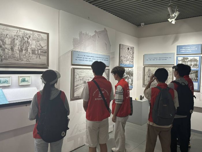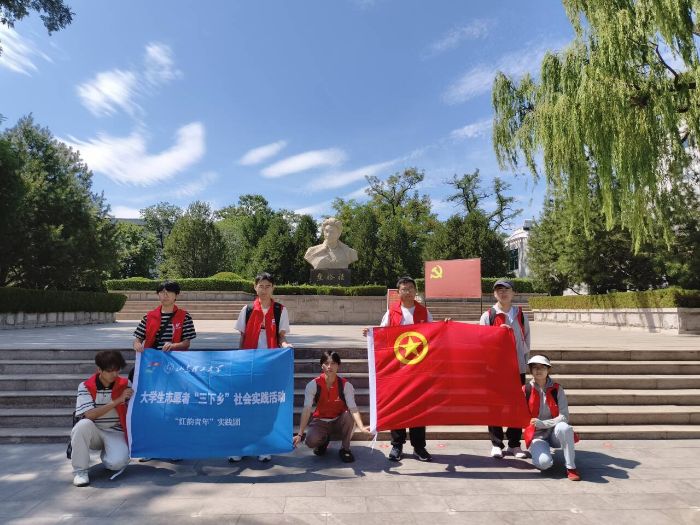 活動(dòng)伊始,實(shí)踐團(tuán)成員身著統(tǒng)一志愿服裝,在紀(jì)念館前整齊列隊(duì)。團(tuán)旗與實(shí)踐團(tuán)旗幟在陽(yáng)光下熠熠生輝,成員們神情肅穆,為本次研學(xué)活動(dòng)奠定莊重而崇敬的基調(diào)。