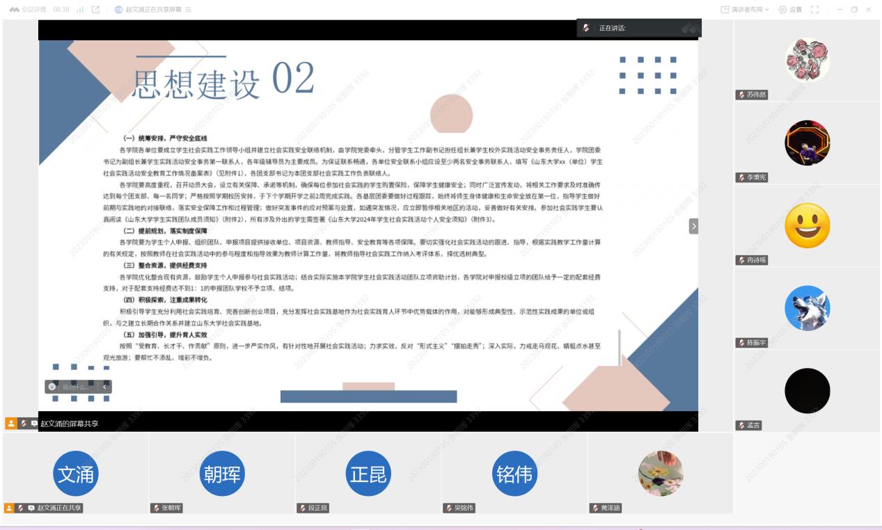 “團隊只有凝聚力和協作能力強,才能更好地完成社會實踐任務。”趙文涌鼓勵團隊成員們積極交流、互助合作,并提出了一些團隊建設的方法和途徑。團隊成員們紛紛發表意見,分享了彼此的團隊合作經驗和思考,達成共識,并制定了一系列團隊建設計劃,旨在增強團隊意識,提升協作能力。最后,趙文涌總結并升華了會議內容,鼓勵團隊成員們將會議討論的成果真正落實到實踐中。他表示,團隊的安全和發展需要每個成員的共同努力,希望大家以更高的標準要求自己,為團隊的成功做出貢獻。