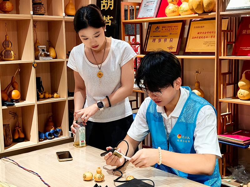 在實操環節,志愿者們手持直刀口、斜刀口等專業工具,小心翼翼地在葫蘆表面勾勒線條、雕琢花鳥紋樣以及富有寓意的吉祥符號。每一刀都傾注著他們對傳統技藝的熱愛與執著。大家都全神貫注地按照店主教授的方法進行創作,從握刀的姿勢到下刀的力度,都反復揣摩、不斷練習,力求將每一個細節都做到完美。