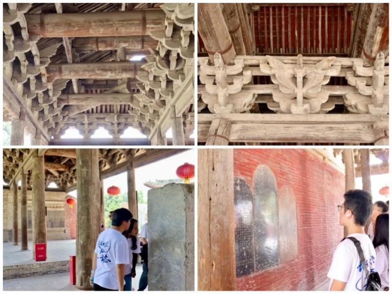 飛云樓精巧絕倫的純木結(jié)構(gòu),宛如無聲的歷史講述者。隊員們仰觀層疊斗拱如云卷云舒,細察梁枋間流淌千年的匠心雕琢。調(diào)研中,隊員們系統(tǒng)記錄樓體結(jié)構(gòu)細節(jié),著重關(guān)注了建筑本體與周邊環(huán)境構(gòu)成的獨特生態(tài)文化系統(tǒng),思考如何為古建撐起更堅實的文化傳承“保護傘”。