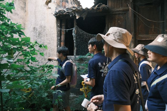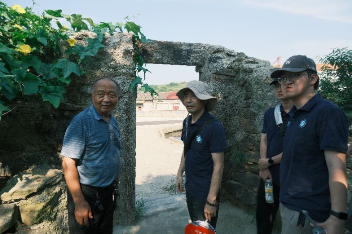 七月,肖霄帶領武漢科技大學“慧眼瞰今測繪鄉村古建,星火擷紅助力鄉村振興”實踐團隊,深入廣水市楊寨鎮大布村方家灣,調研這座歷經烽火與百年風霜的古建筑群。他沿古城墻殘存的墻基從南門樓行至北門樓,輕撫滄桑的石門,陽光下石料閃爍的星光與鬢間銀絲交相輝映,無聲訴說著這場跨越時空的對話。走進村子,現代水泥房與青磚古宅相鄰,鋼筋水泥與青瓦白墻相互滲透,邊界在時光里漸漸模糊交融。