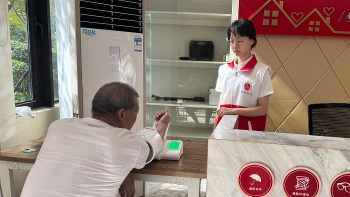 值守服務臺時,志愿者化身“服務先鋒”,耐心解答居民從社區設施到政策咨詢的各類疑問,主動幫扶,搭建社區與居民的“貼心橋梁”。遇到測血壓老人,細致協助操作、關切身體,以問候和服務傳遞關懷。