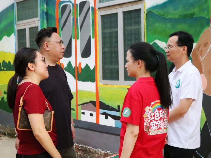 (圖為紅色印記實踐團與莫藝雄書記實地考察與探討墻繪文案 李卓婧攝)