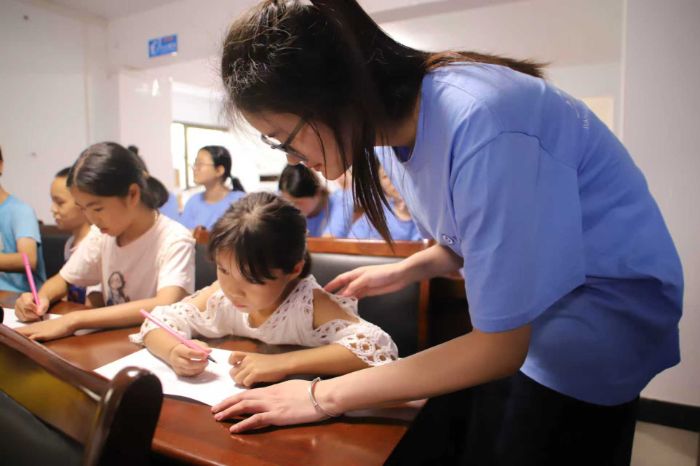 圖為身著藍(lán)色隊(duì)服的實(shí)踐隊(duì)員正俯身指導(dǎo)兒童進(jìn)行繪畫創(chuàng)作。