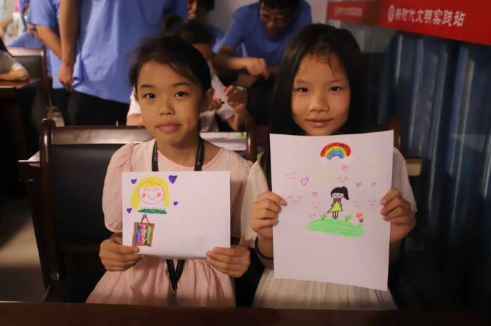 圖為兩位小朋友正自豪展示充滿童趣的創(chuàng)作成果。