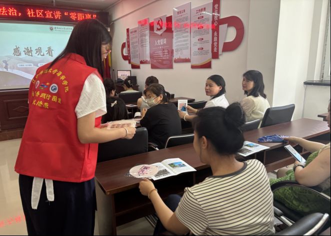 7月21日,盡管烈日炎炎,宣講團成員仍然準時到達凱地家園社區。成員們為社區的基層群眾帶去了扇子和鑰匙扣等小禮品,隨后宣講團成員劉懿瑤通過PPT形式進行反詐騙宣講,結合社區真實案例,教居民用法律化解噪音擾民、物業矛盾,守護“家門口”的權益,同時,用通俗的語言講解了社區基層群眾關心的法律問題,并且通過案例剖析,重點普及了防詐騙的實用技巧。