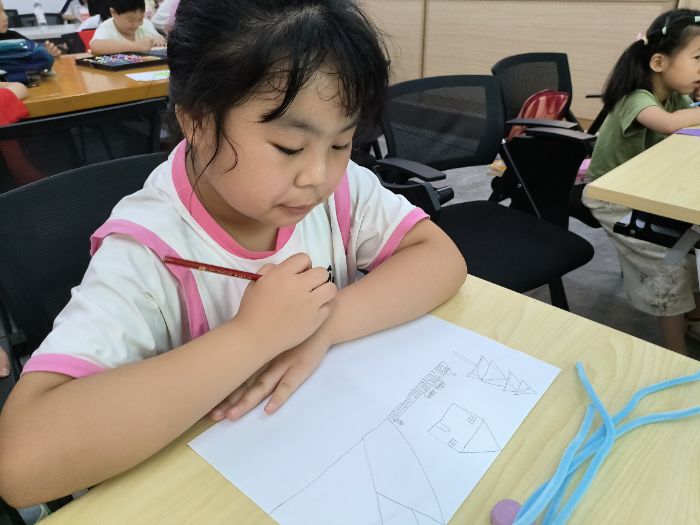 小朋友們拿起畫筆,發揮想象力,開始創作和三角形有關的圖形。有的將三角形組合成太空火箭,有的用不同顏色的三角拼出海底世界,還有的把三角化作森林里的小木屋。小朋友龔家奕筆下的小三角一會兒是土堆,一會兒又化身交通指示牌,還變成魚缸里游動的小魚。他興奮道:“我還想讓小三角變成水底的石頭,這樣小魚就有地方躲啦。三角形什么都能變,就像玩積木一樣,拼一拼、換個顏色,就能變成全世界!”