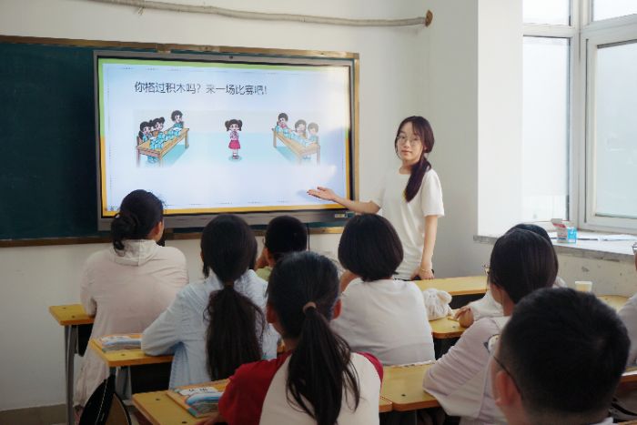 小學(xué)組則聚焦“長(zhǎng)方體的多視圖觀察物體”從長(zhǎng)方體所呈現(xiàn)的平面圖形特征來展開教學(xué),實(shí)踐團(tuán)成員王昊珉設(shè)計(jì)積木比賽創(chuàng)設(shè)趣味情境,組織學(xué)生分組動(dòng)手拼擺、對(duì)比觀察,通過“看實(shí)物—畫圖形—說特征”的互動(dòng)環(huán)節(jié),讓孩子們?cè)趯?shí)踐中理解立體圖形與平面視圖的轉(zhuǎn)換規(guī)律,有效培養(yǎng)空間想象能力與動(dòng)手操作能力,讓抽象的空間概念在直觀體驗(yàn)中變得清晰易懂。