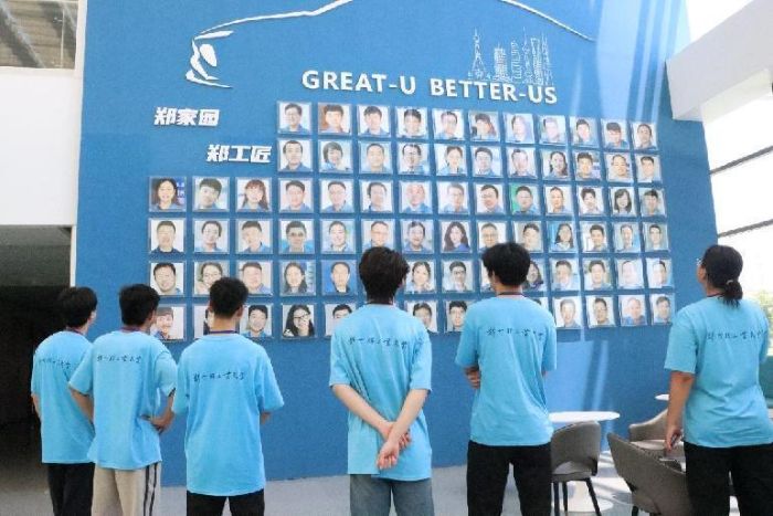 隨后,實踐團隊來到工匠墻前駐足。這面墻上展示優秀員工日常工作照片,還特別標注了他們與企業發展的重要關聯,是無無數數的他們為2023年鄭州基地新能源車型占比突破35%奠定技術基礎。講解員強調:“這些工匠的故事,正是企業從‘制造’走向‘智造’的微觀縮影。”