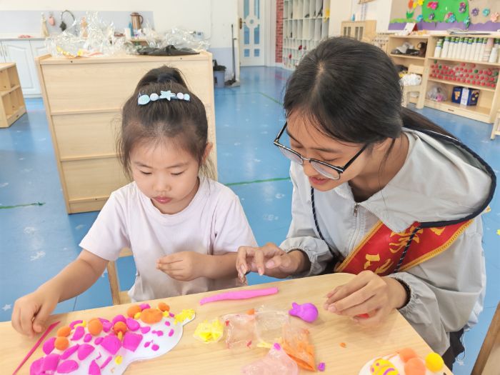 圖為志愿者指導(dǎo)孟達(dá)幼兒園小朋友進(jìn)行泥塑制作。楊福森 攝