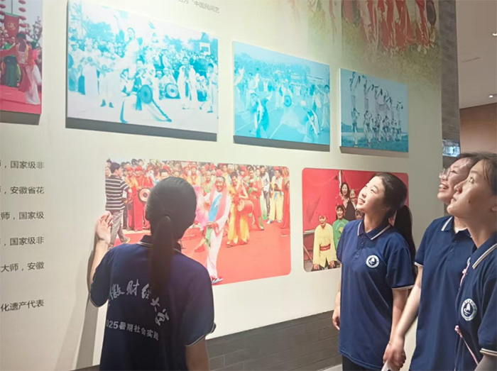 實(shí)踐隊(duì)的文化探尋之旅從懷遠(yuǎn)縣文化館開(kāi)始。推開(kāi)那扇古樸的大門(mén),仿佛穿越時(shí)空,每一件展品都在輕聲訴說(shuō)著花鼓燈的滄桑與輝煌。隊(duì)員們屏息凝神,小心翼翼地用鏡頭記錄下這些珍貴的文化印記。當(dāng)步入數(shù)字文化展廳時(shí),眼前豁然開(kāi)朗——全息投影技術(shù)將傳統(tǒng)藝術(shù)演繹得栩栩如生,古老的花鼓燈在數(shù)字科技的映襯下煥發(fā)出前所未有的生機(jī)。最令人動(dòng)容的是,在這里,白發(fā)蒼蒼的老者與稚氣未脫的孩童同樣駐足流連,孩子們眼中閃爍著好奇的光芒,不斷向?qū)嵺`隊(duì)員拋出天真的問(wèn)題,這一幕讓人真切感受到文化傳承的希望與力量。