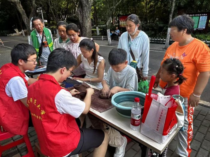非遺體驗(yàn)進(jìn)市民,傳承文化基因從身邊做起 7月4號-5號,在淮北相山公園志愿站的支持下,團(tuán)隊(duì)成員在相山公園內(nèi)部進(jìn)行了擺攤展示,并向廣大市民非遺泥塑文化。期間,許多小朋友聚集在攤位前駐足觀看,并與家長一起參與到泥塑體驗(yàn)中來,其中一位小朋友完成泥塑作品杯子的制作后,開心的對團(tuán)隊(duì)成員說:“我要把這個杯子送給爸爸!”這不僅是親子間美好互動的回憶,也是對非遺文化潛移默化的珍貴傳承。