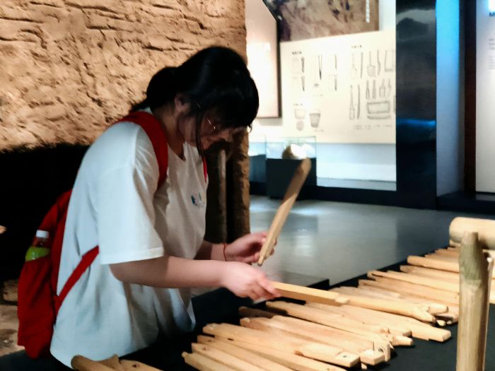 實踐團成員李芳在黃石國家礦山公園展館內動手體驗傳統采礦工具 楊志慧攝