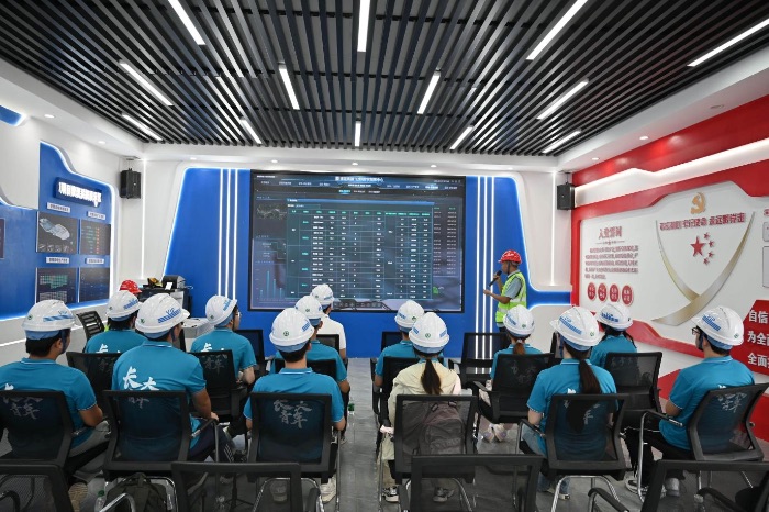 離開智慧梁場,實踐隊來到智慧數字指揮中心。巨大的電子屏上,工程進度、人員分布、設備狀態、環境監測等數據實時更新,構成一幅動態的“智慧建造圖譜”。工作人員介紹,該中心整合BIM技術、物聯網與大數據分析平臺,實現了梁體生產、存儲、運輸、安裝全流程的可視化管理。根據介紹,“哪個環節出現異常,系統會立即預警;資源調配是否合理,數據會給出最優方案”。