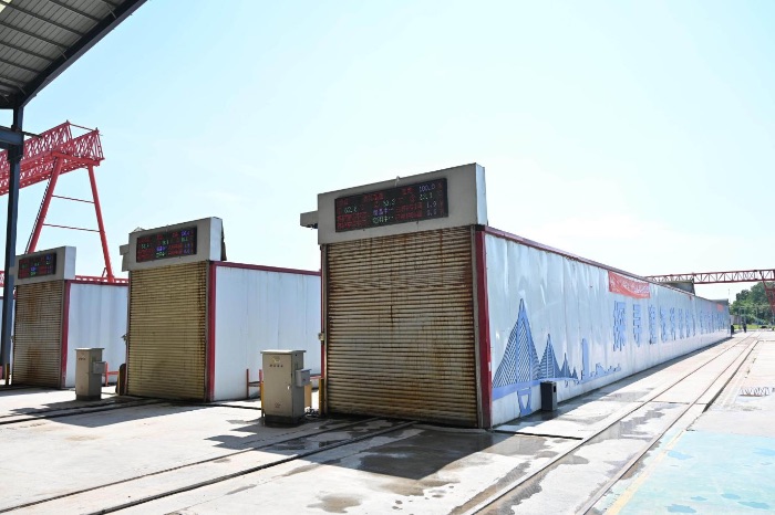 實踐隊首先來到TJ2標段智慧梁場。在項目副經理聶啟波的帶領下,依次參觀了智慧梁場的主要功能區域。智慧梁場占地面積84畝,設5條自動環形生產線,生產線包含鋼筋半成品加工區、鋼筋胎架區、臺車前移橫區、混凝土澆筑區、蒸養區、張拉壓漿區及臺車后橫移區,單條生產線總長300m。聶啟波介紹到,項目智慧梁場打造了多處微創新環節,融入數字智能打造智慧工地的同時,還采用了移動臺車附著式振搗器、箱梁張拉應力消解底模、預制梁頂板振搗整平裝置等一系列工藝亮點。