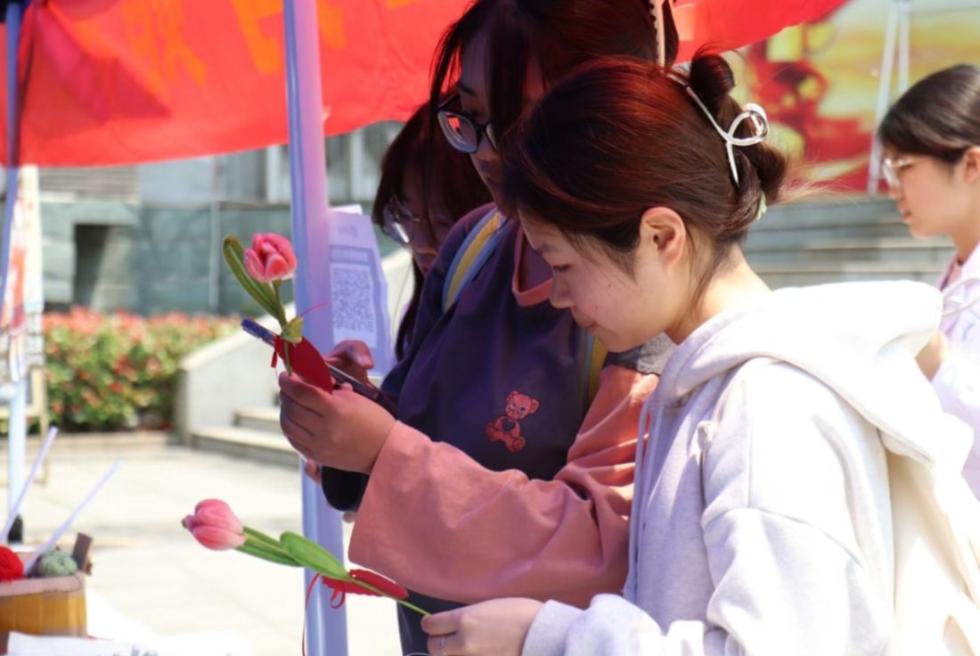 本次活動(dòng)中,同學(xué)們共收集制作精美別致、創(chuàng)意獨(dú)特的編織掛件等手工作品近百件。鉆石畫(huà)、奶油膠發(fā)卡以及由串珠制成的各種手鏈等精致的手工藝品吸引了師生紛紛駐足。大家挑選心儀的作品,奉獻(xiàn)自己的一份愛(ài)心。