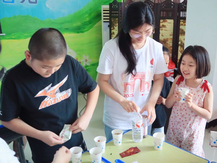 品味千年古韻,喚醒文化記憶。團隊成員劉慶妍為孩子們開啟了一段浸潤心靈的“茶香之旅”。課堂上,她帶領孩子們一起追溯茶的起源,探秘中國的六大茶類世界,了解從嫩葉到香茗的蛻變之旅。當不同品類的茶葉在杯中舒展身姿,孩子們好奇地觀察、細細嗅聞,再小口啜飲,感受或清新、或醇厚、或甘甜的滋味在舌尖綻放,那一刻,他們明亮的眼睛閃爍著對古老智慧的新奇,小小的茶杯里,盛放的是跨越時空的文化馨香。這縷茶香,如同夏日里的一泓清泉,不僅滋潤了舌尖,更悄然浸潤著孩子們對中華優秀傳統的認知與向往,為他們的成長增添了一抹悠遠而溫潤的底色。