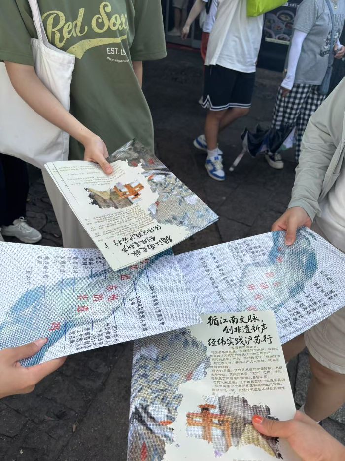 喚醒:海報揚文帆,非遺渡新潮 通過實地調研與親身體驗,成員們梳理江南文化脈絡,圍繞上海評彈、絨繡以及蘇繡等蘇州非遺文化設計了宣傳海報。于7月20日和7月23日分別在上海豫園商圈、蘇州平江路歷史街區發放海報宣傳非遺文化,用視覺與標語的沖擊性盡可能的將信息輻射給更多的人,為滬蘇兩地的非遺文化貢獻青春力量,書寫當代價值。