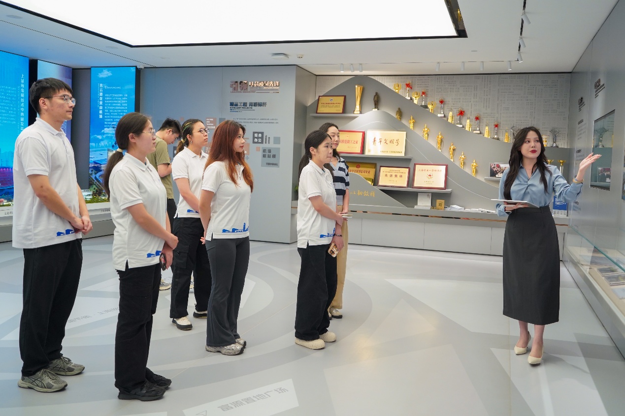實踐團來到企業文化展廳進行學習。展廳里呈現的中建八局上海公司發展歷程,從浦東開發初期的基建老照片,到上海保利大劇院等模型,見證了企業開拓的足跡。在國家建設和重要發展階段,都有中建八局上海公司的奮斗身影,這是海派鐵軍企業文化的生動體現。通過講解員的細致講述,實踐團深切感悟企業將鐵軍硬朗作風與海派精細考究相融合的獨特文化氣質,也明確了工程師在城市生長與時代變革中的責任擔當。