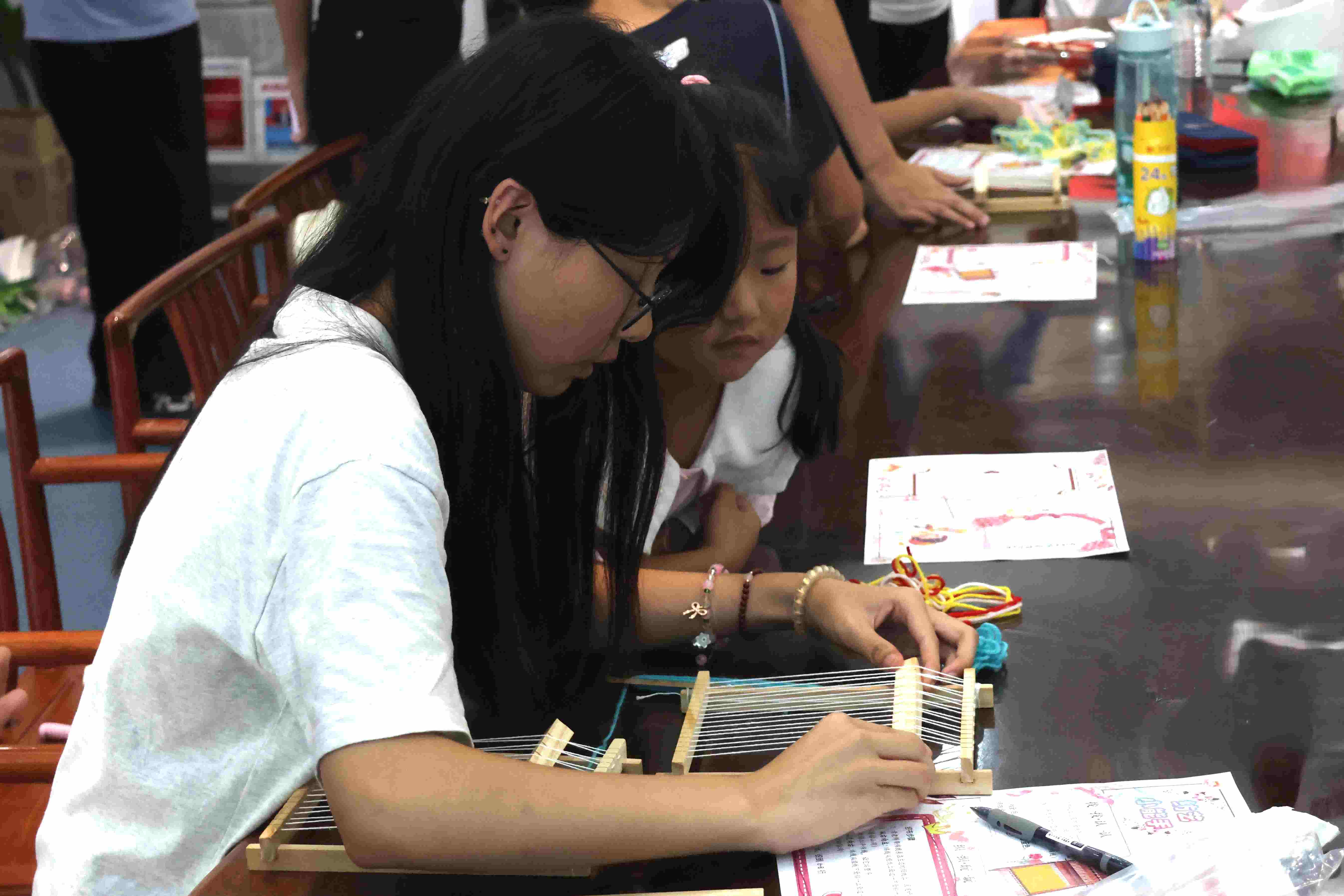 隨后,孩子們分組使用手工織布機(jī)完成布藝作品,在系結(jié)、穿插、拉平的協(xié)作中切身感受到紡藝的魅力。經(jīng)緯交織間,蘊(yùn)藏著一絲一線的勾勒;五彩交錯(cuò)間,凝聚著無(wú)邊際的暢想。孩子們沉浸在合作織布中,用心、用眼、用手體會(huì)百年前的傳統(tǒng)老技藝。