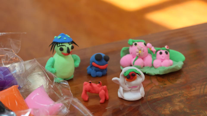 超輕粘土體驗區同樣熱鬧非凡。團隊成員將粘土分發給老人們,鼓勵大家發揮想象,塑造心中的模樣。對于沒有思路的老人,成員們在一旁適時提供幫助,或調整造型,或搭配顏色,與老人們共同完成一件件充滿巧思的作品。粘土在指尖的揉捏中,變成了承載記憶與情感的載體,拉近了彼此的距離。當粘土作品擺上展臺,那些稚拙的形態恰是跨越年齡的赤子之心最本真的表達。