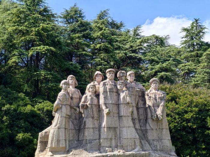步入雨花臺烈士陵園,烈士就義群雕屹立著。烈士就義群雕由九位不同身份的烈士組成:工人、農民、知識分子、軍人、學生、少女、報童、地下黨員、國際友人。這九位烈士的身份涵蓋不同階級、性別、年齡,突出革命是全民的覺醒與抗爭。他們昂首挺胸、緊握鐐銬、怒視遠方,無一人低頭跪伏,象征著革命者的尊嚴。烈士精神從未死去,它已嵌入民族的脊梁,化作前行路上的燈塔。