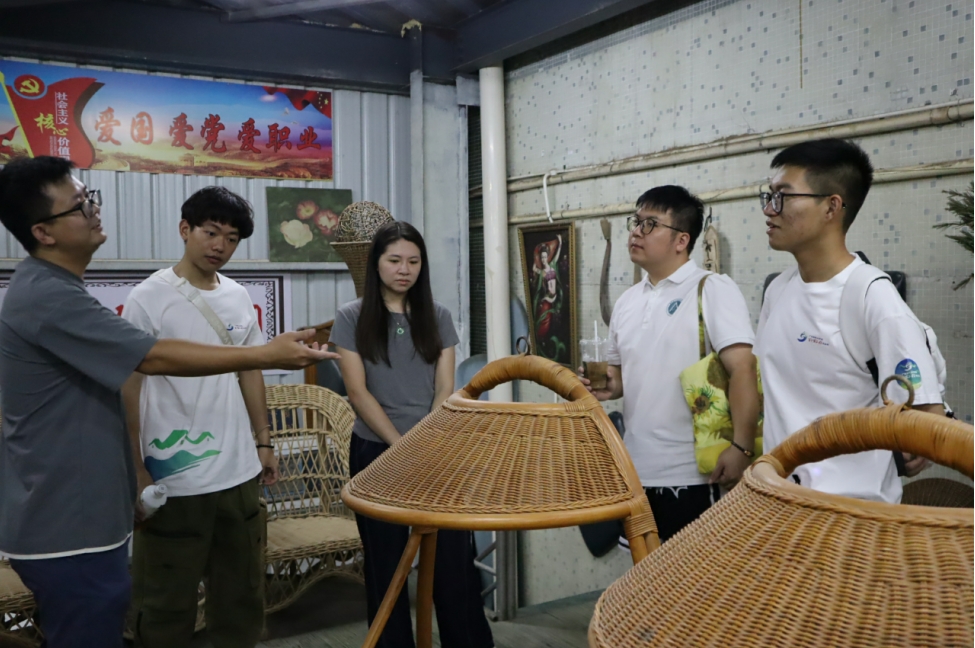 在建益-藤緣家具有限公司生產車間,實踐團成員近距離觀察老師傅們精湛的編織技藝。從藤條篩選、浸泡軟化到手工編織,每一道工序都凝聚著工匠的智慧與心血。"單是編織環節就需大半天時間",公司負責人徐君介紹道。在展廳內,造型精巧的嬰兒搖床、綴著細密流蘇的秋千椅、兼具美觀與實用的小鴨造型果盤等作品,展現了傳統工藝的現代魅力。