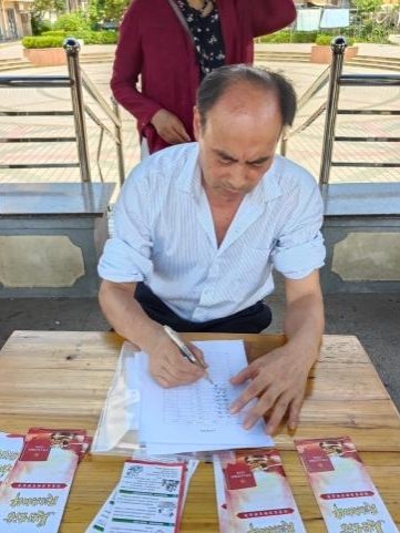 圖為聽眾在橫幅上簽字,表明敬法守法的決心。安安供圖