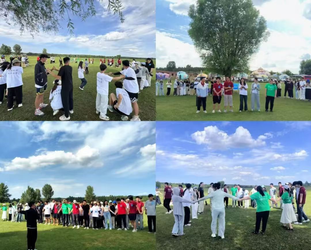 賽場以趣味橫生的破冰游戲拉開序幕,各高校實習實踐隊隊員們通過“你畫我猜”“團隊拼圖”等創意互動消融初見的拘謹,迅速組建跨校聯盟。轉戰充滿草原特色的各項趣味賽事項目中展開智慧與體力的雙重較量,賽程中切磋技藝、分享心得,更在“集體拔河”“博克摔跤”等協作挑戰里自然敞開心扉。當夕陽為草原鍍上金邊時,歡聲與默契已交織成一幅生動的青春畫卷,這場天然社交場不僅讓校際協作從紙面走向實踐,更在草原的懷抱中孕育出真摯的情誼紐帶。