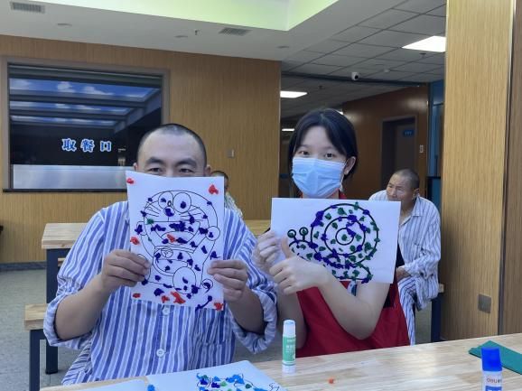 第三天,成員們已能在老師監護下獨立分發藥物,細致確認患者服藥情況。患者活動時,他們全身心陪伴,一同拼拼圖、涂色、寫毛筆字、下棋,在互動中傳遞關懷,也加深了對患者心理需求的理解。