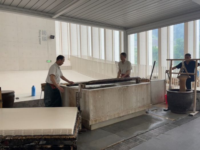 在宣紙技藝體驗區(qū),成員們零距離觀摩傳統(tǒng)制作工藝。工匠師傅現(xiàn)場演示青檀皮與沙田稻草的選料、蒸煮、打漿、撈紙、曬紙等流程,細(xì)致講解每一環(huán)節(jié)的技藝要點。在竹簾起落間體會“千滴汗凝一紙”的艱辛,深刻感悟“工匠精神”的厚重內(nèi)涵。