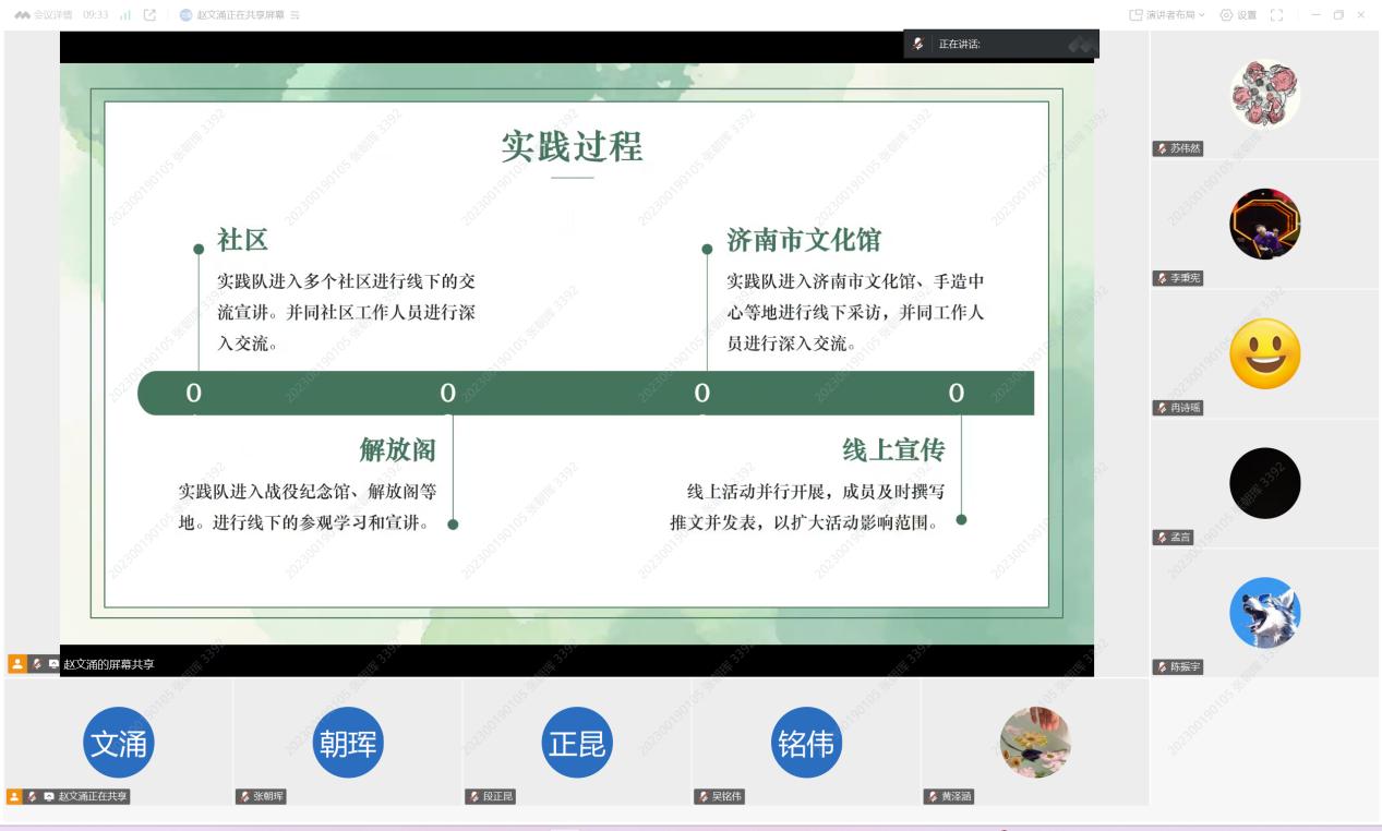 為確保社會實踐項目圓滿完成,7月27日,“青衿新程筑夢行”社會實踐隊隊長趙文涌召開了本次社會實踐的后期工作會議。會議就視頻剪輯、采訪推文、社會實踐報告以及結項工作等事宜進行了詳細安排。