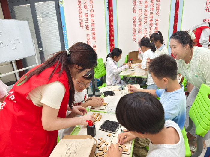 非遺活字印刷術課程中,團隊成員細致示范字模揀選、刷墨勻涂、鋪紙按壓的核心步驟,指導孩子們排版印制古詩、諺語、名言等內容的作品,讓他們在親手操作中體會漢字之美以及古代印刷術的智慧結晶。