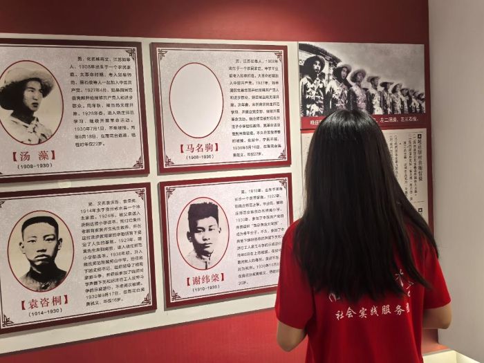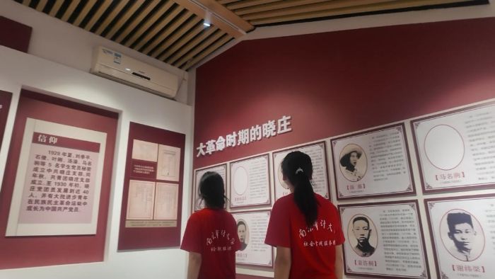 實踐團隊將調研重點放在場館紅色資源開放情況上,首先參觀了曉莊社區黨史教育館的三層展廳,以此學習優秀紅色數據開放案例。團隊成員的足跡從一樓曉莊歷史科普區開始延伸——社區自制的三分鐘微視頻里,當地發展脈絡清晰可見;拾階而上至二樓的形勢文化博物館,這聚焦了1927至1930年曉莊的主要行動;而三樓的曉莊黨史展區更令團隊成員印象深刻,它以曉莊10位革命烈士事跡為主線敘述曉莊革命史,圖文并茂展示紅色曉莊百年歷程,訴說那段風雨如晦中依然堅守的革命往事。在馬名駒、袁咨桐等烈士的事跡展前,隊員們久久佇立,烈士墻上那一雙雙堅定而又充滿光亮的眼睛穿越近百年時光,與青年學子的目光在展廳交匯,革命先輩以生命踐行信念的赤誠,在寂靜展廳中激蕩起跨越時代的精神共鳴。