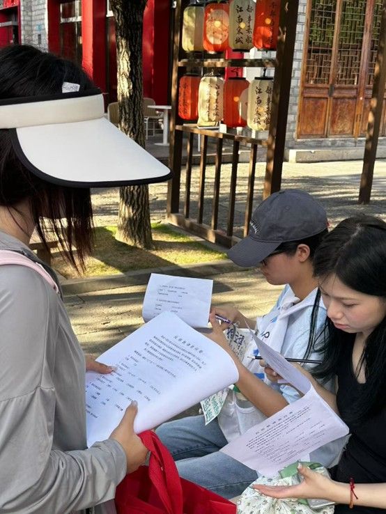 實踐隊員攜帶多份反邪漫畫手冊、宣傳手提布袋,在古街核心區域布設宣傳點。隊員們兵分三路:一組在步行街前設立咨詢臺,結合臨海本地邪教案例向商戶剖析"治病免災""投資返利"等常見騙術;剩余人員分成4組行動,在景區內向商戶,攤販,游客,食客宣傳,并以問卷的方式了解他們對于反邪教現存的了解,加以手提袋洗碗巾等為獎品,吸引游客家庭參與互動。