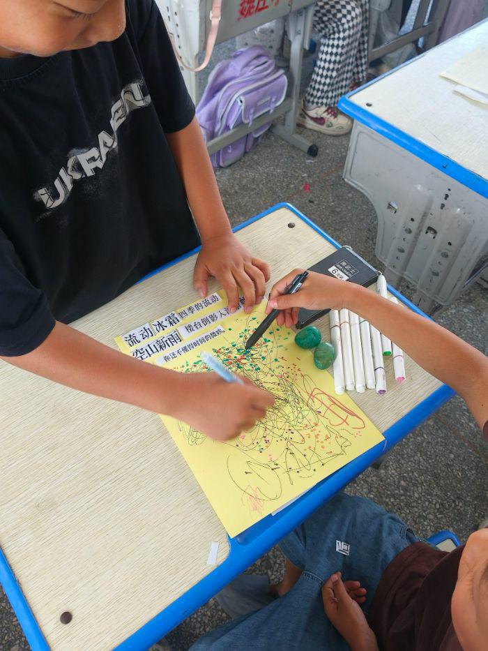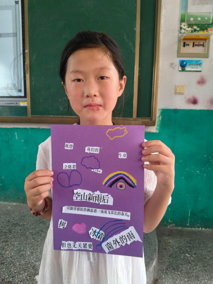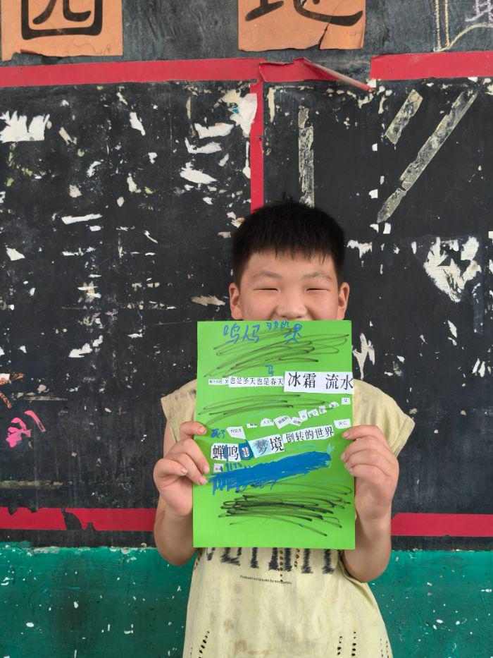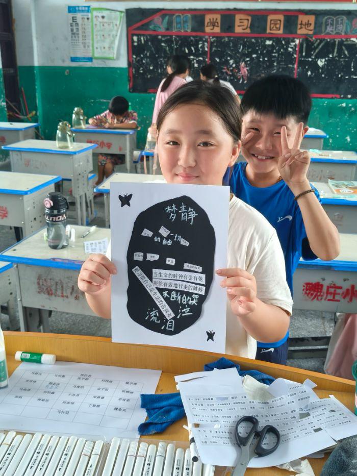 7月22號下午,河南省商丘市魏莊小學的教室里洋溢著一片歡樂而溫馨的氛圍。在支教團成員都語菲老師的帶領下,小朋友們迎來了一堂充滿創意與詩意的拼接詩課。剪刀、彩紙、膠水、詩句……孩子們興奮地用他們靈巧的雙手,剪貼出一個個屬于自己的獨特而富有詩意的世界。