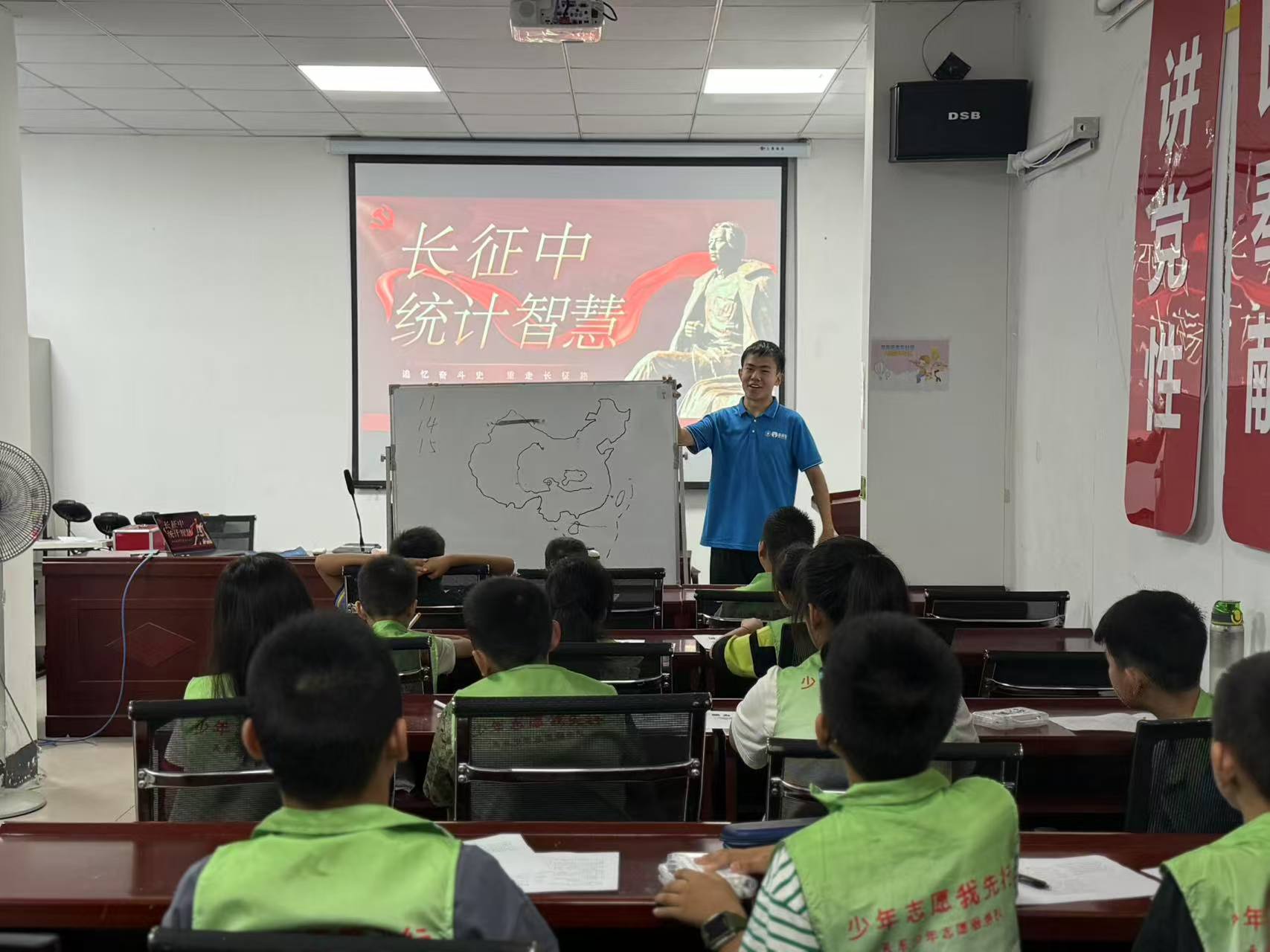 實踐隊隊長付智鵬講授《長征中的統計智慧》,將宏大敘事轉化為具象任務:通過互動問答、角色扮演和故事化講解,將紅軍長征的戰略決策轉化為孩子們能理解的“數據密碼”。課堂上,孩子們用簡易統計表模擬紅軍行軍方案,激烈討論如何分配糧食、規劃路線;通過扮演“紅軍參謀”,用統計表計算湘江戰役后剩余兵力,討論“如何用有限糧食支撐雪山行軍”……整堂課笑聲與思考交織,長征精神在數據分析和情景模擬中變得鮮活可感。