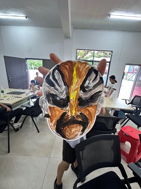 臉譜手工課上,隊員們先給孩子們講述了臉譜背后的傳統文化故事,隨后分發彩筆、卡紙等材料。孩子們圍坐在一起,認真地在卡紙上勾勒線條、填充色彩,一個個原本空白的臉譜在他們手中變成了色彩斑斕、形態各異的藝術品。有個小男孩拿著自己畫的臉譜,興奮地對隊員說:“老師,你看我畫的,是不是很威風?”