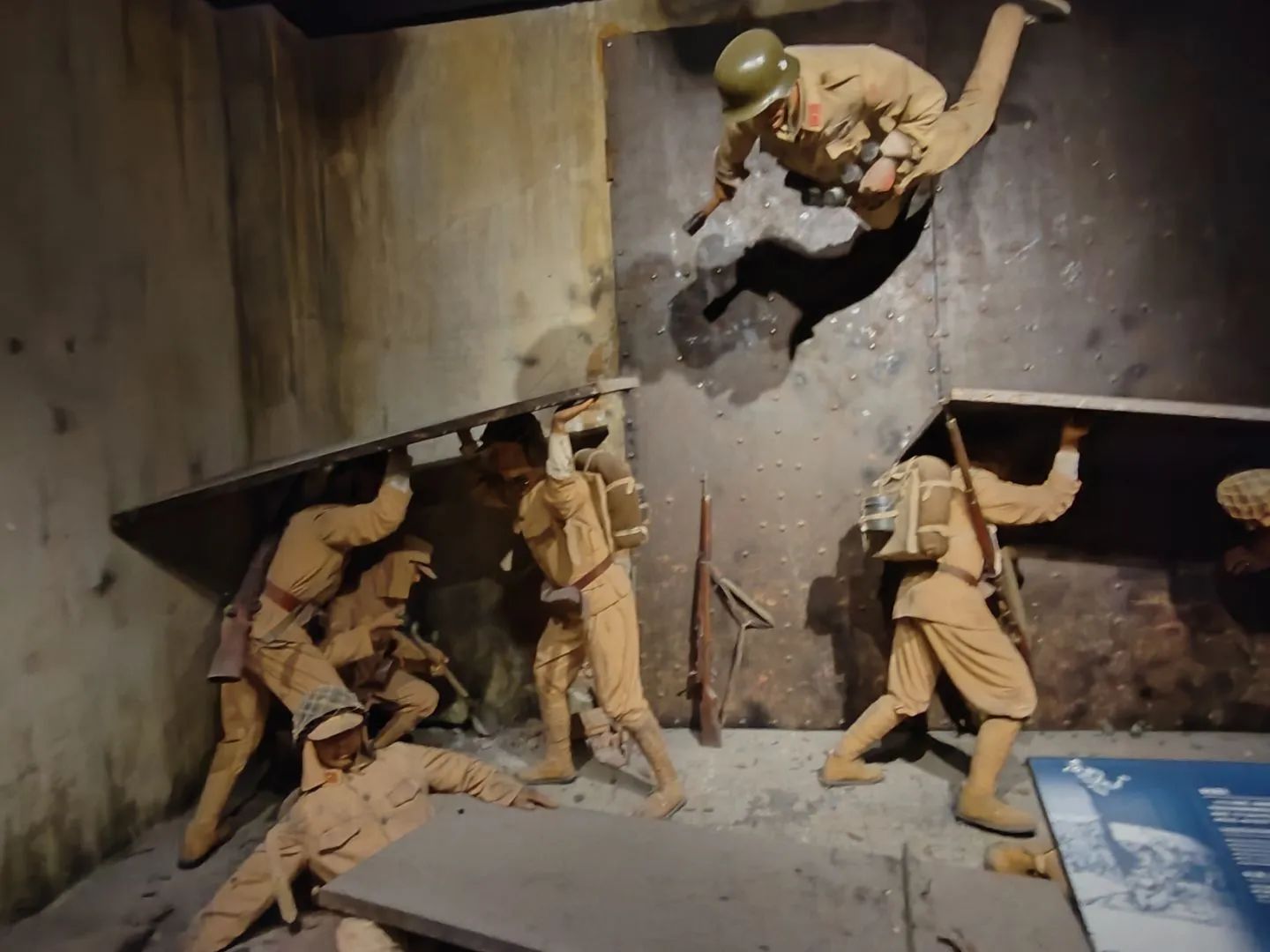 雕塑再現了倉庫墻垣被敵艦炮轟開缺口、敵兵涌入的危急關頭。數位戰士挺身而出,毅然拉響手雷與敵同歸于盡,用血肉之軀填補了防線的缺口。隊員們感受到將士們熔鑄生命的忠誠擔當,以及向世界宣告抗戰到底的鋼鐵意志與必勝信念。