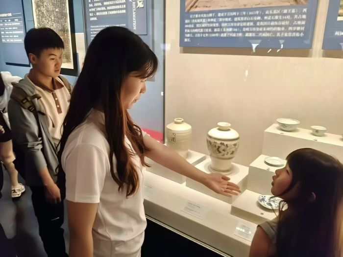 漫步“宋遼金元”展區(qū),汝窯瓶的天青色釉面溫潤(rùn)典雅,作為宋代官窯瓷器的代表,定格著汝窯瓷器的審美追求,實(shí)踐團(tuán)成員陳問(wèn)問(wèn)用生動(dòng)易懂的語(yǔ)言為孩子們講解瓷器的歷史、工藝和文化價(jià)值,現(xiàn)場(chǎng)互動(dòng)氛圍十分熱烈。