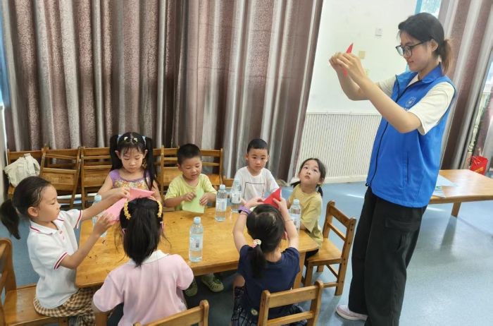 在龍岡鎮(zhèn)鳳凰幼兒園,實踐隊員們精心設(shè)計了折紙手工、益智游戲和動畫鑒賞等趣味活動,為孩子們打造沉浸式學(xué)習(xí)體驗。隊員采用“示范+互動”的教學(xué)方式,在折紙教學(xué)中融入健康食物的觀念,通過趣味食物折紙,教導(dǎo)孩子們分辨蔬果和垃圾食品;在“小廚師的選菜任務(wù)”游戲中培養(yǎng)孩子們對不同食物的認知,并精選優(yōu)質(zhì)國產(chǎn)動畫進行大食物觀的引導(dǎo);顒硬粌H豐富了孩子們的假期生活,更在潛移默化中提升了他們的食品安全意識、動手能力和社交技能。通過近距離觀察與互動,實踐團深入了解了城鎮(zhèn)地區(qū)學(xué)前兒童的成長需求,為后續(xù)開展更具針對性的教育幫扶活動積累了寶貴經(jīng)驗。