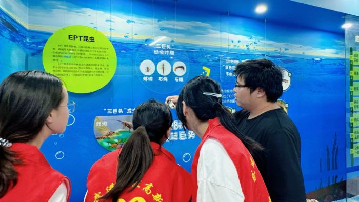 展館一樓,陳列著多種本地動植物、鳥類、魚類標本,二樓的水生生物特色展廳則更加吸引隊員們的目光。王雷帶領隊員們了解了具有“水質指標生物三巨頭”美名的EPT昆蟲(蜉蝣、石蠅、石蛾),通過對比不同污染程度下它們的生存狀態,揭示了“水中小生物,生態大文章”的道理:“它們(指EPT昆蟲)對水質變化極其敏感,一旦水體出現污染,它們的種類和數量會立刻發生改變,堪稱天然的‘水質監測員’。”