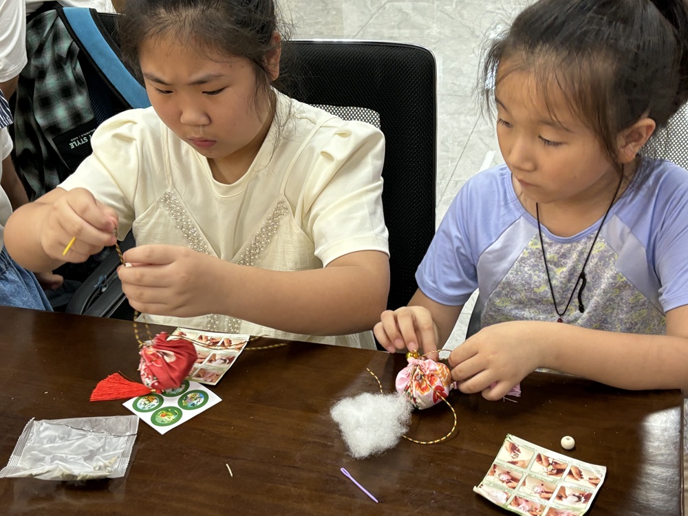 香囊制作兼具深厚的文化意涵與生活實用價值。實踐團成員們向孩子們講述了香囊在傳統文化中的寓意,如驅蟲辟邪、祈福安康等。接著,實踐團成員們分發制作香囊的材料,包括香料、布料、絲線等。孩子們認真地將香料裝入香囊,并進行組裝。不一會兒,一個個小巧玲瓏、香氣四溢的香囊就誕生了。香囊制作是一場“文化浸潤+情感培育+能力塑造”的綜合體驗,讓孩子們在觸摸傳統的同時,學會表達、收獲成長,讓小小的香囊承載起遠超器物本身的意義。