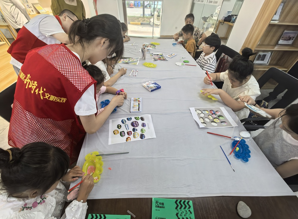 石頭畫環節亦樂趣盎然。實踐團成員們帶領孩子們收集形狀各異的石頭,然后指導他們用顏料在石面上創作。孩子們將這些天然石塊視作獨特的畫布,以斑斕色彩勾勒心中的美好圖景:有的孩子畫了可愛的小動物,有的畫了美麗的花朵,還有的畫了夢幻的城堡......每一件石頭畫作品都盈滿童真意趣,恰似一扇扇窗口,映照著孩子們豐盈澄澈的內心世界。這場創作體驗,不僅讓孩子們的藝術素養在實踐中得以積淀,更讓他們的審美感知在斑斕色彩與奇思妙想中持續提升。