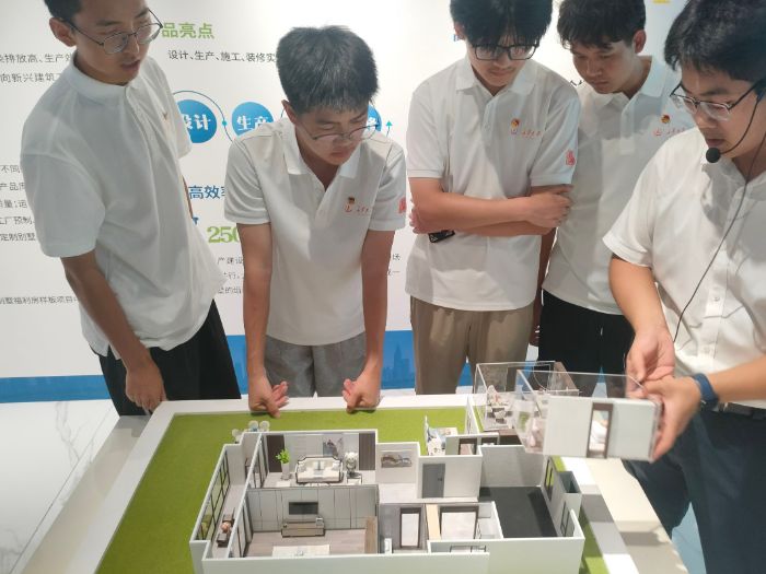 實踐隊還走進現代化裝配式建筑生產基地。自動化生產線精準完成構件預制,機械臂與工人協同作業,生動詮釋了“20天建成一棟樓”的技術革新。綠色建材展示區內,采用純木重組技術打造的生態建筑格外引人注目。通過近距離觀摩預制墻板、疊合梁等構件的標準化生產,隊員們深切感受到數字化與綠色理念在建筑領域的深度融合。